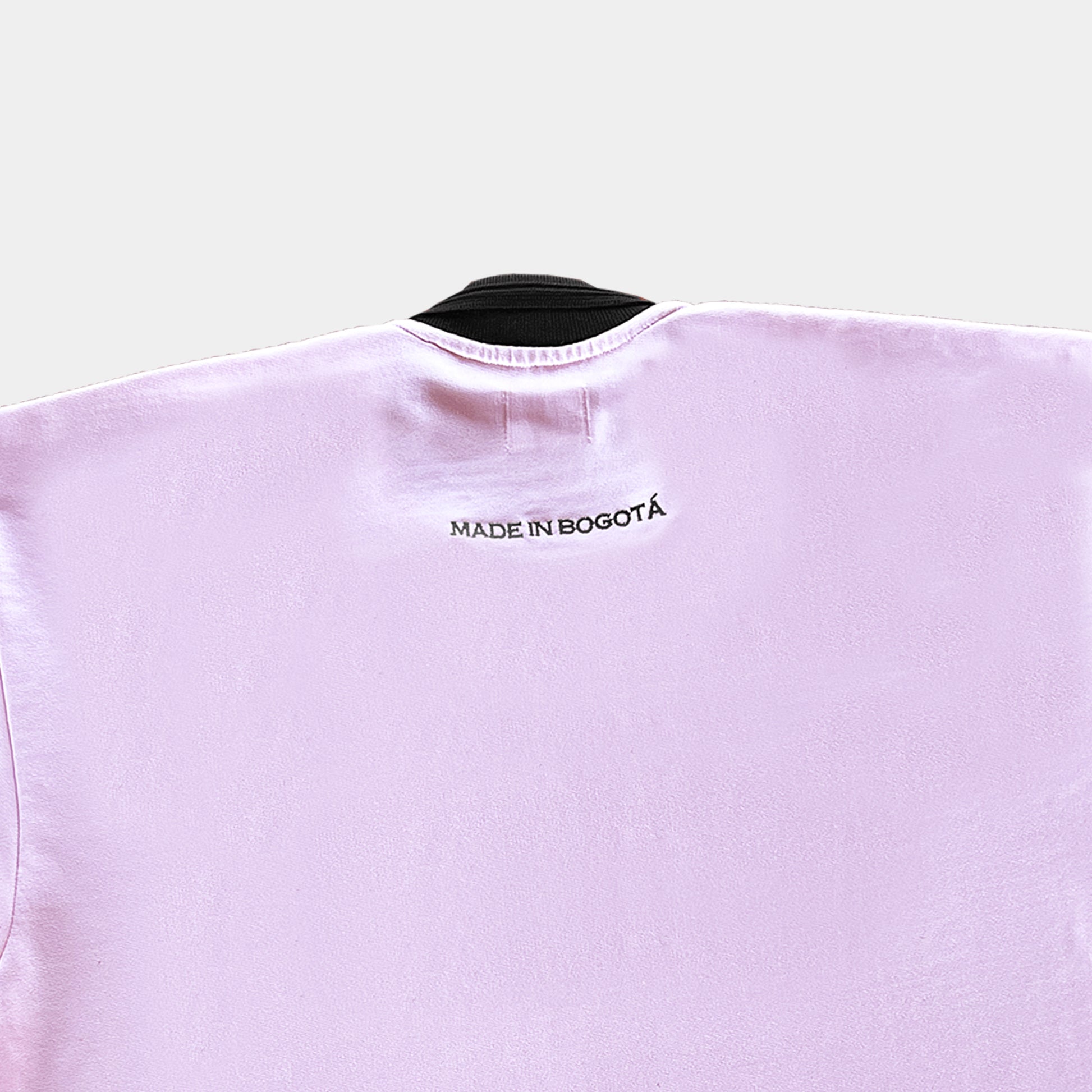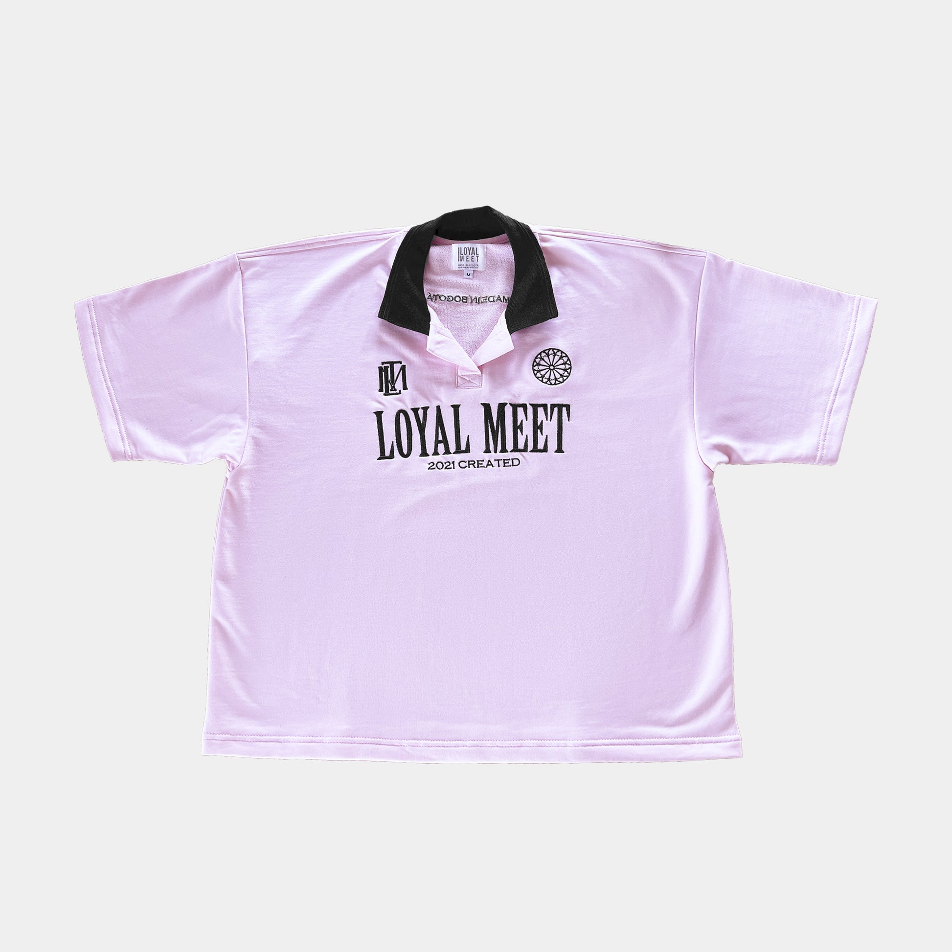 Camiseta rosada tipo polo con bordado delantero y trasero.