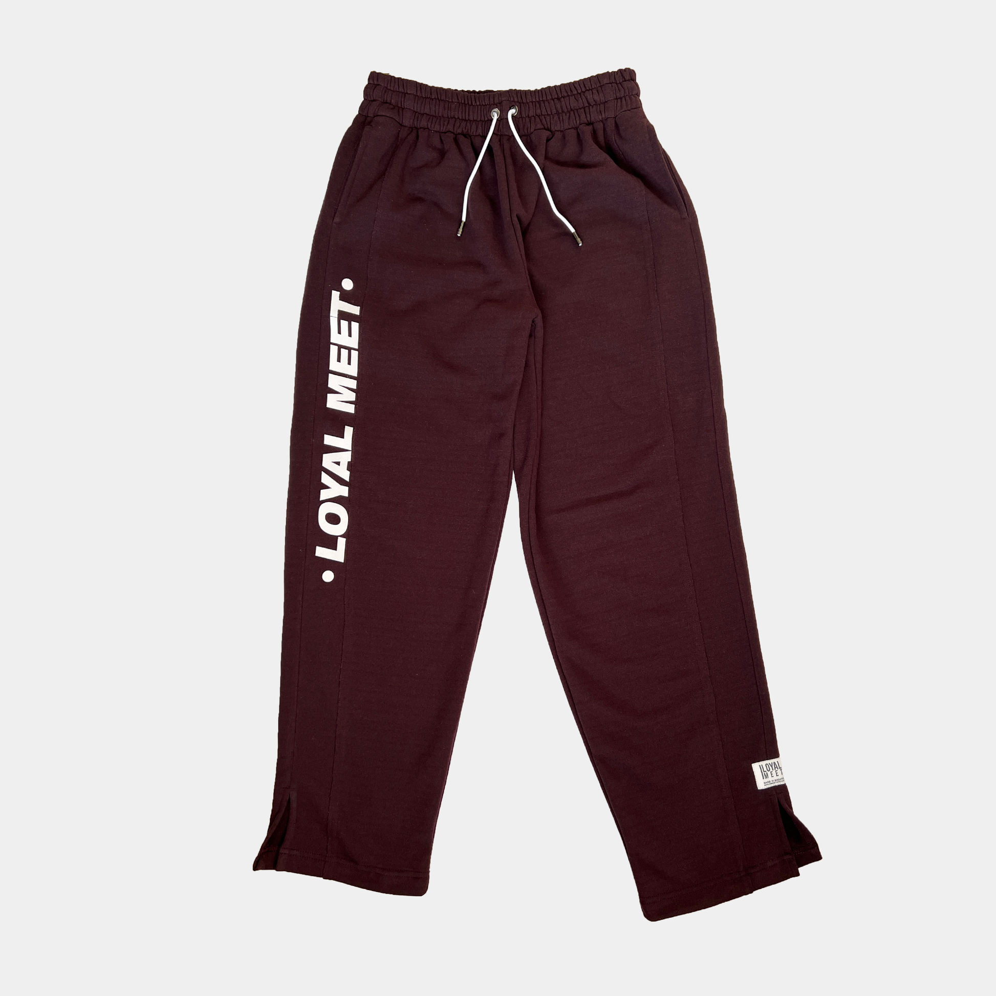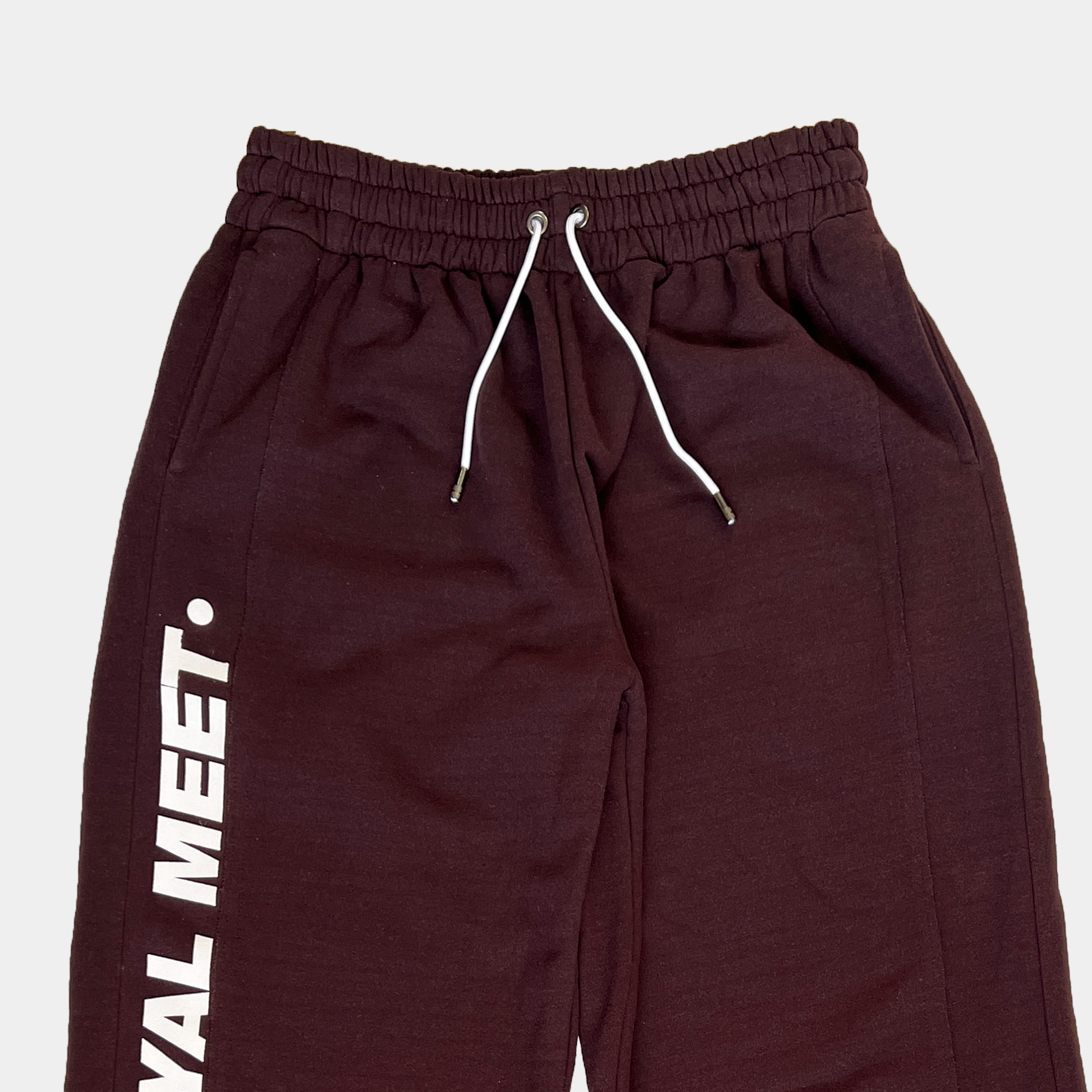 Pantalón vinotinto con bolsillos laterales y posteriores. Tiene el nombre estampado en un costado y cordones ajustables en la cintura y botas. Su silueta es holgada y tiene un detalle en la bota y costados.